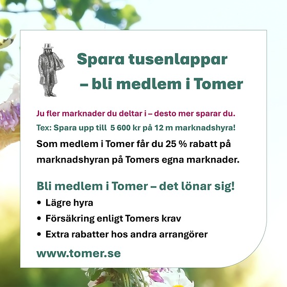 Som medlem i Tomer får du 25 % rabatt på marknadshyran på Tomers egna marknader. Ju fler marknader du deltar i – desto mer sparar du.