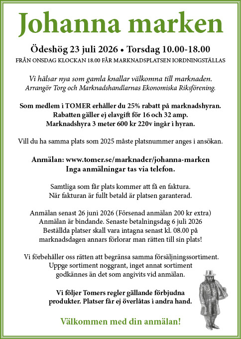 Beställda platser skall vara intagna senast kl. 08.00 på marknadsdagen annars förlorar man rätten till sin plats! Vi förbehåller oss rätten att begränsa samma försäljningssortiment.Uppge sortiment noggrant, inget annat sortiment godkännes än det som angivits vid anmälan.